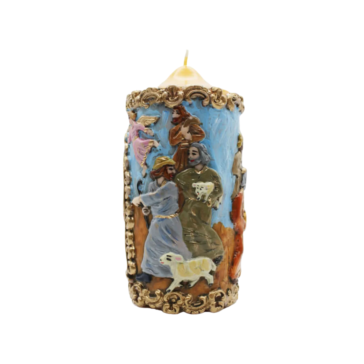 Crafted in hand-painted beeswax, this candle showcases the Nativity Scene with the Three Wise Men, shepherds, and an angel. A perfect Catholic prayer candle to inspire a magical holiday atmosphere.