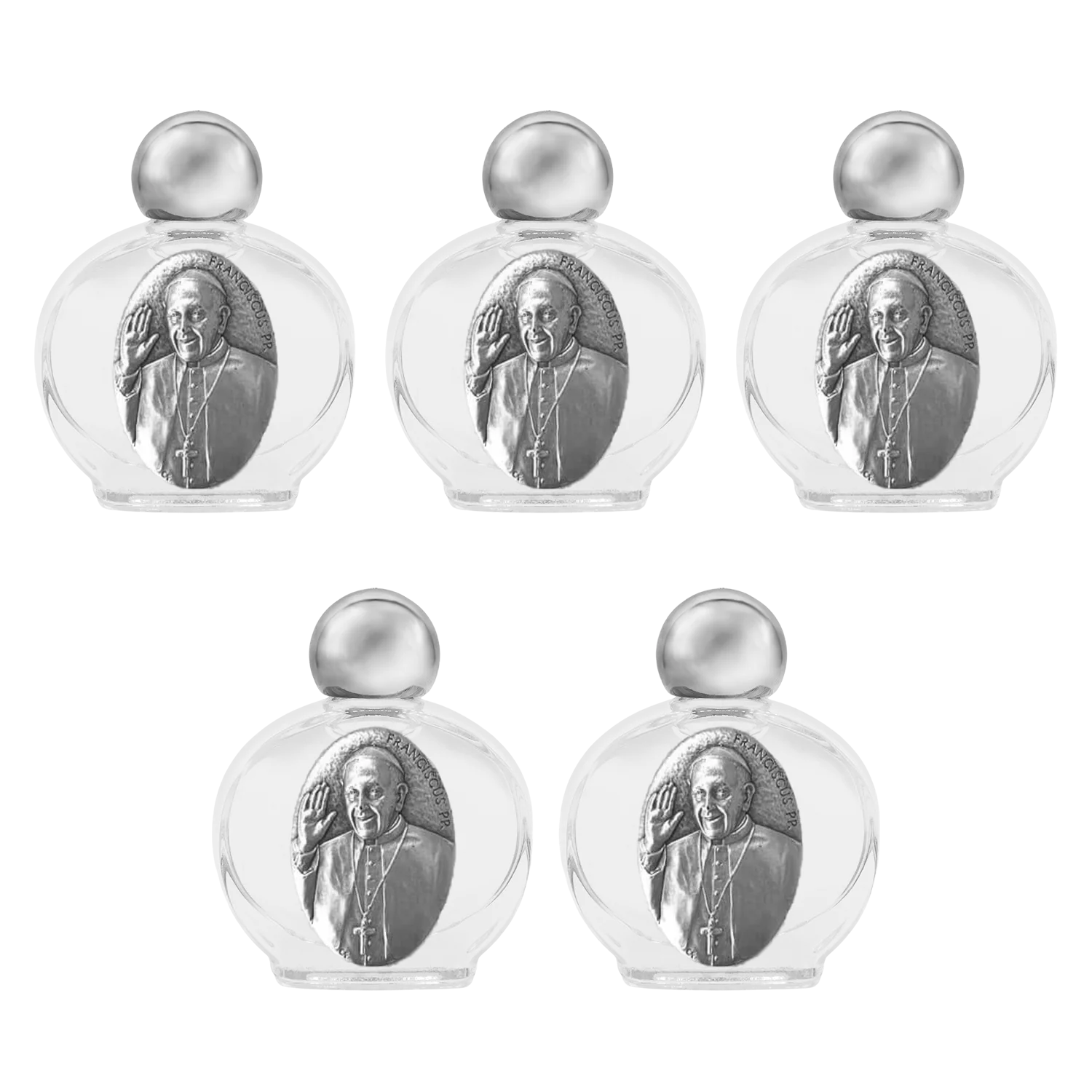 Set of 10 ml glass bottles with metal foil depicting Pope Francis, available in sets of 3 or 5 pieces.