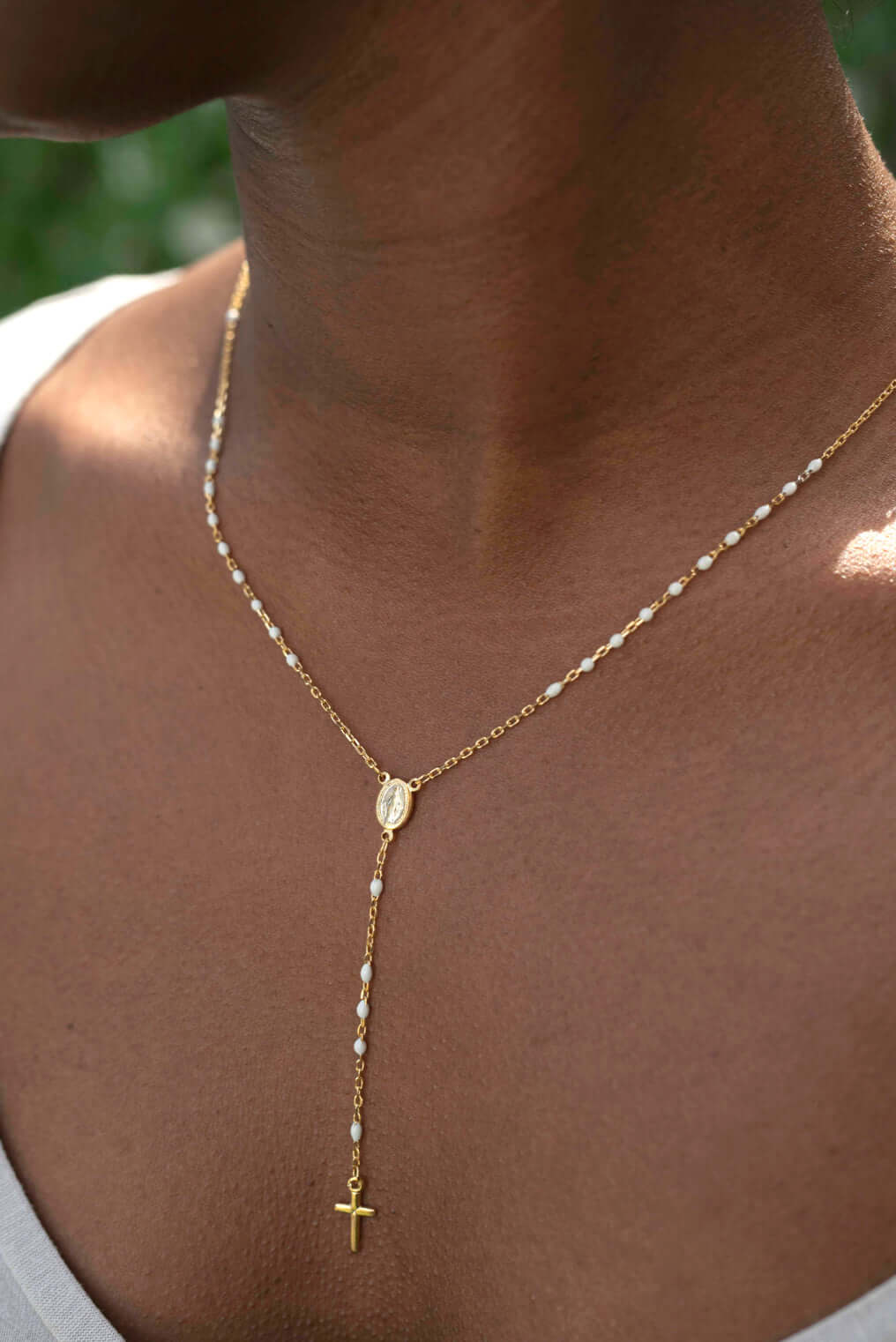 Finely handcrafted rosary necklace in 18K gold-plated sterling silver with white enamel 2mm beads.
