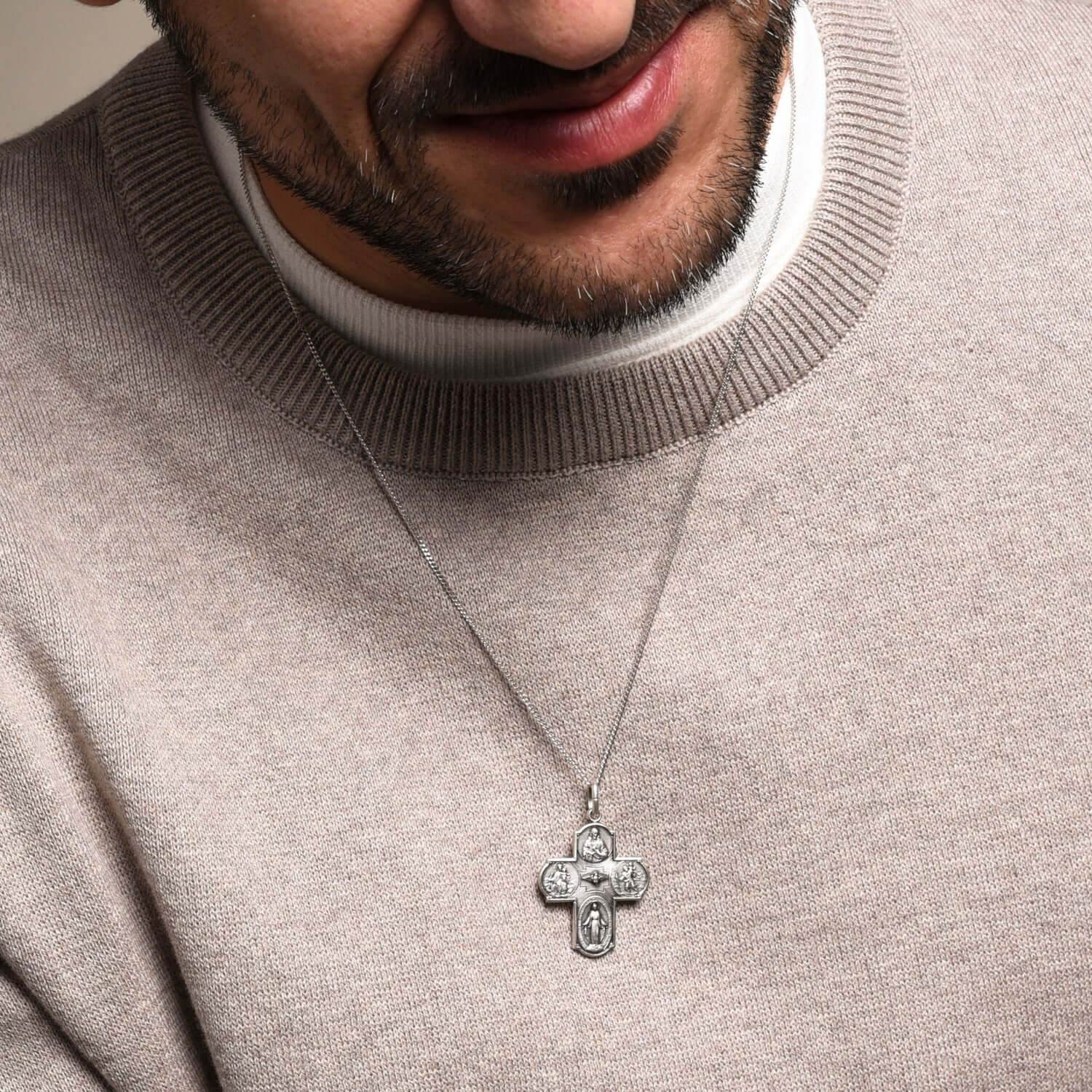 Scapular cross made of 18K solid white Gold. Also known as the 4 Way Cross, this cross pendant encompasses four iconic religious medals: the Sacred Heart of Jesus, Our Lady of Mount Carmel, St Christopher, and the Miraculous Medal. At the center is the Holy Spirit dove, while on the back of the Scapular are featured the reverse of the Miraculous Medal, St Peter’s Basilica, and the “Rome” inscription.
